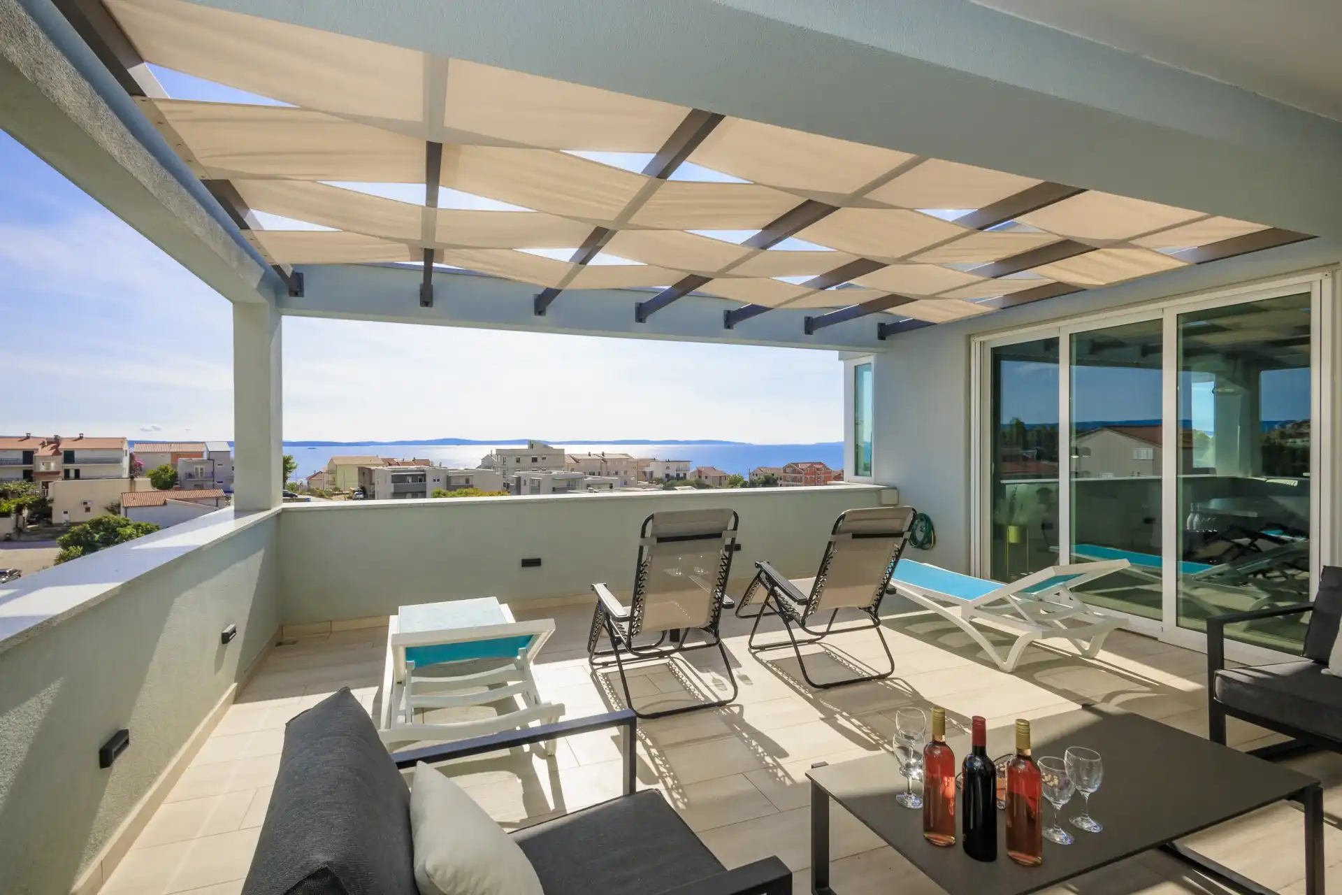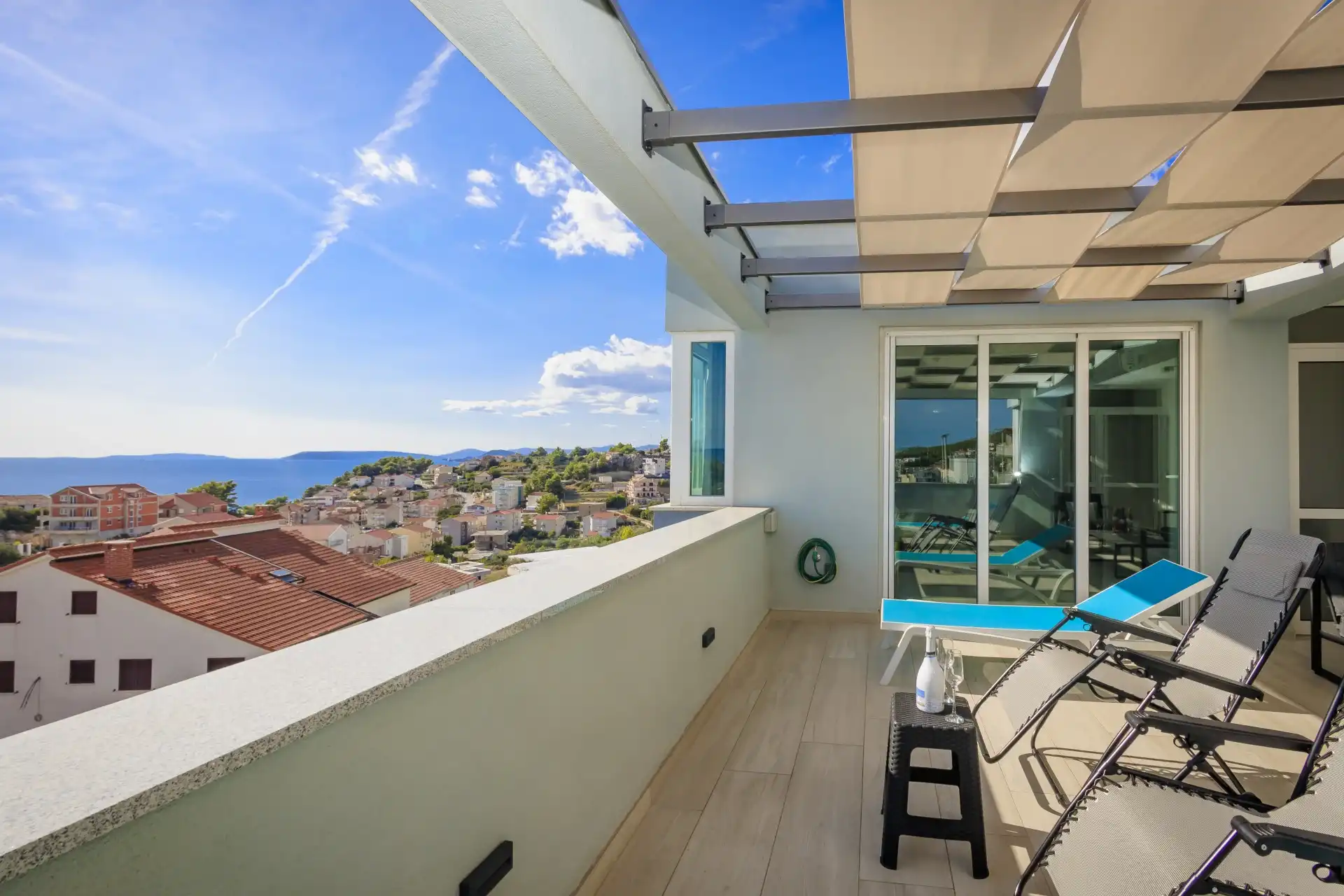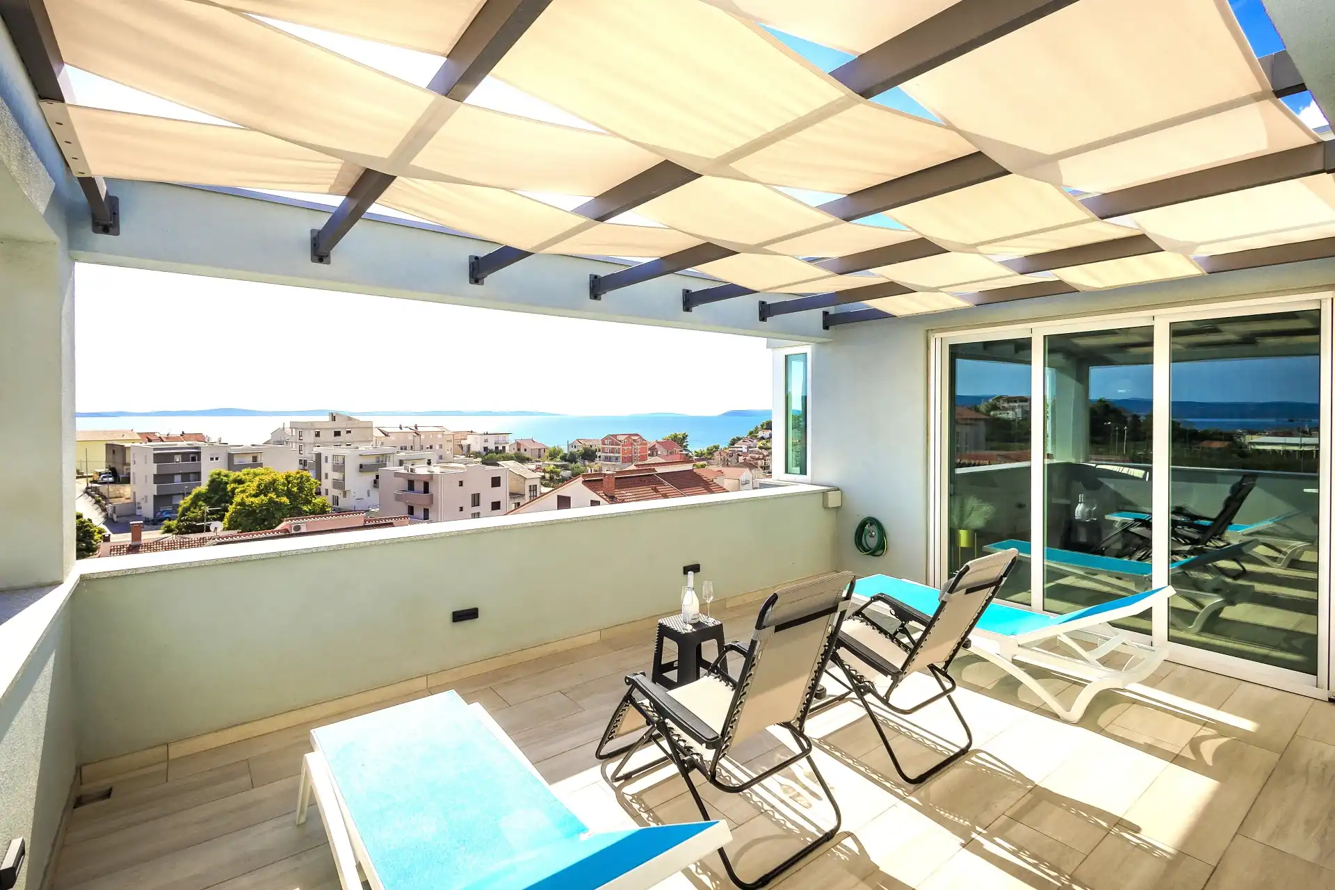 What makes this Penthouse special is a beautiful private terrace for relaxation (sun loungers) and plenty of space for gathering and socializing (table and chairs) with an unobstructed beautiful view of the Adriatic Sea with nearby islands.