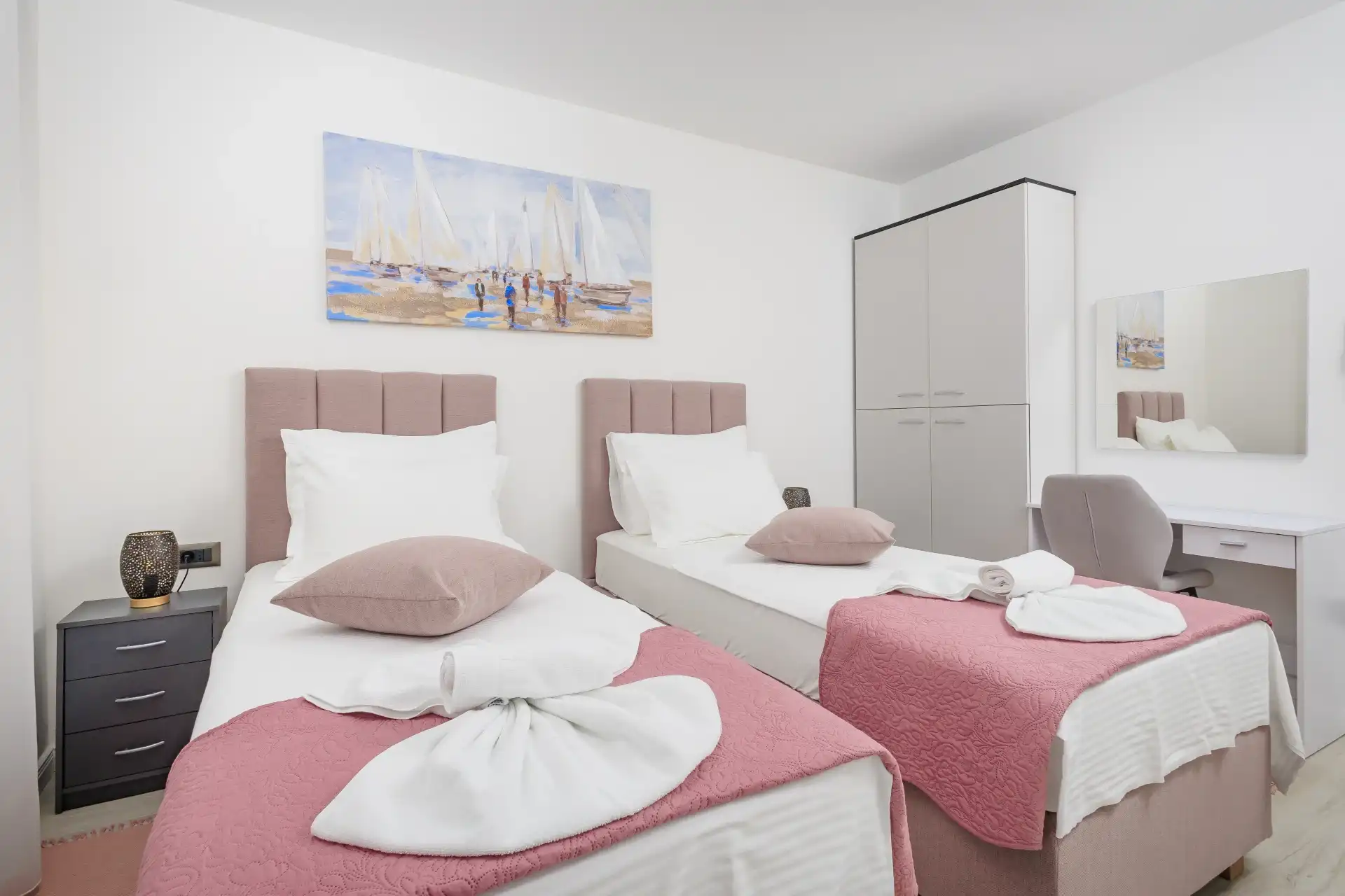 * Two separate single beds (90x200cm) quickly connected into a double bed 180x200cm for couples (king size bed) which flexibility is ideal for a family.